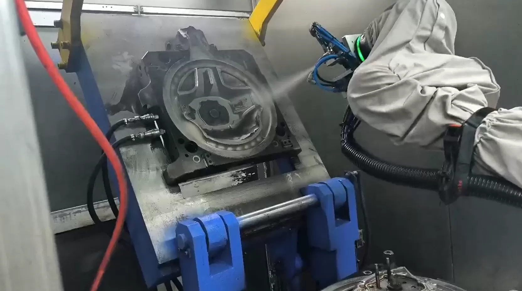 汽车行业方向盘生产,汽车方向盘由金属骨架和外圈的发泡注塑组成,发泡过程需要在上下模具上进行喷涂脱模剂防止粘黏,来方便发泡完将方向盘取出,同时在脱模剂的表面还需要喷涂黑色的油漆,保证方向盘的颜色,整个作业的工艺几乎适用所有车企。